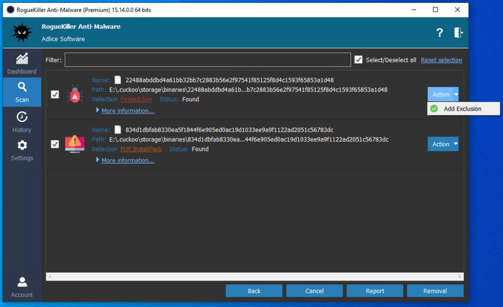 After a scan is done, you may want to ignore some of the detection(s), for some reason. Even if we don’t recommend it (in case of a false positive, it’s always better to let us know), it’s possible to add a scan item into the exclusions. To do so, use the “Action” menu and “Add exclusion”.