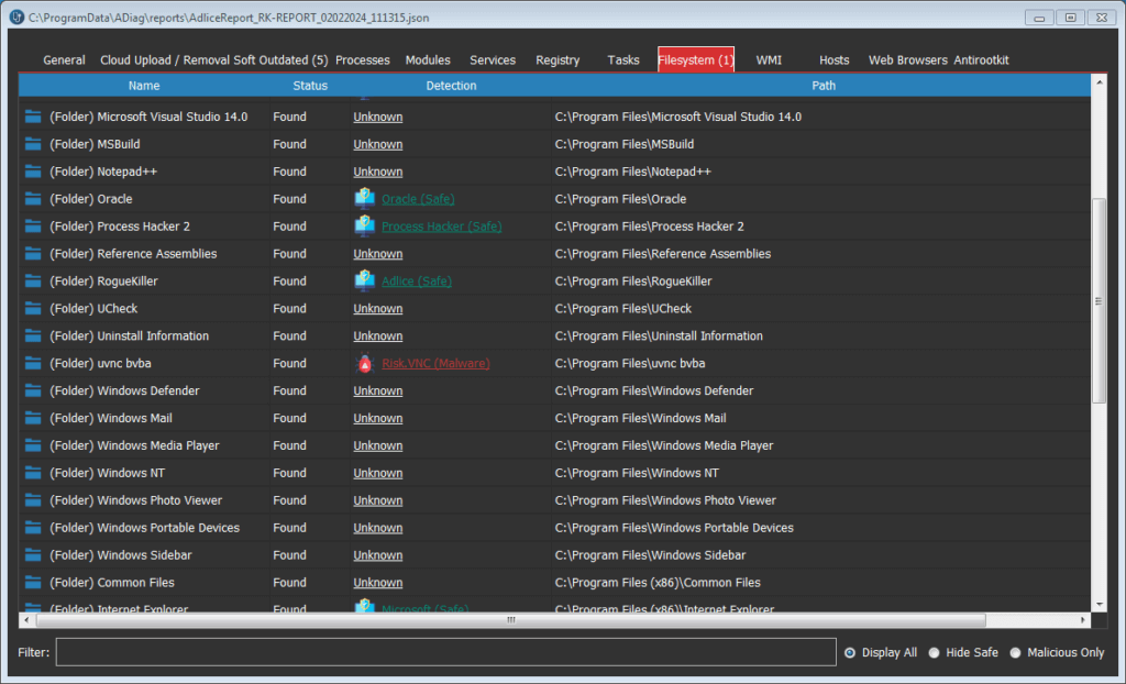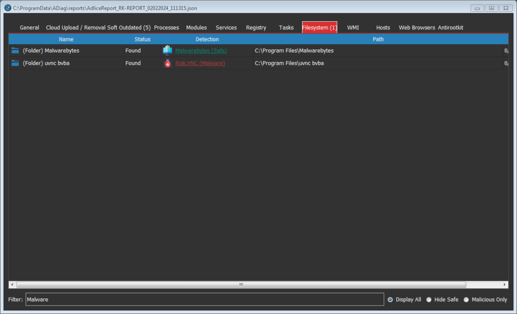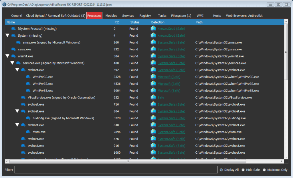 You can either use the “Display all/Hide safe/Malicious only” to hide or show specific elements.