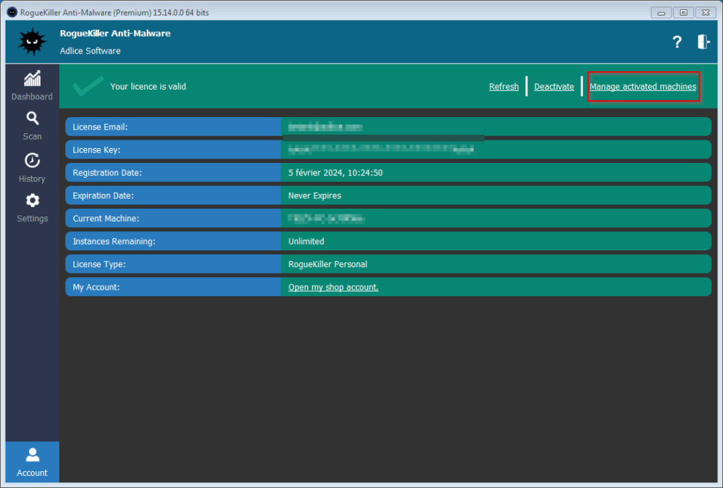2. If for some reason this is not possible, it can also be achieved in the software. Open the software in “Account”, then click on “Manage activated machines”.