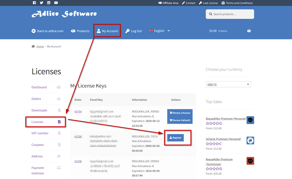 Once you’ve got your license key, it needs to be used to register the software. You will find your license key in the invoice sent by our shop, it contains 2 important informations: “License email” and “License key”.