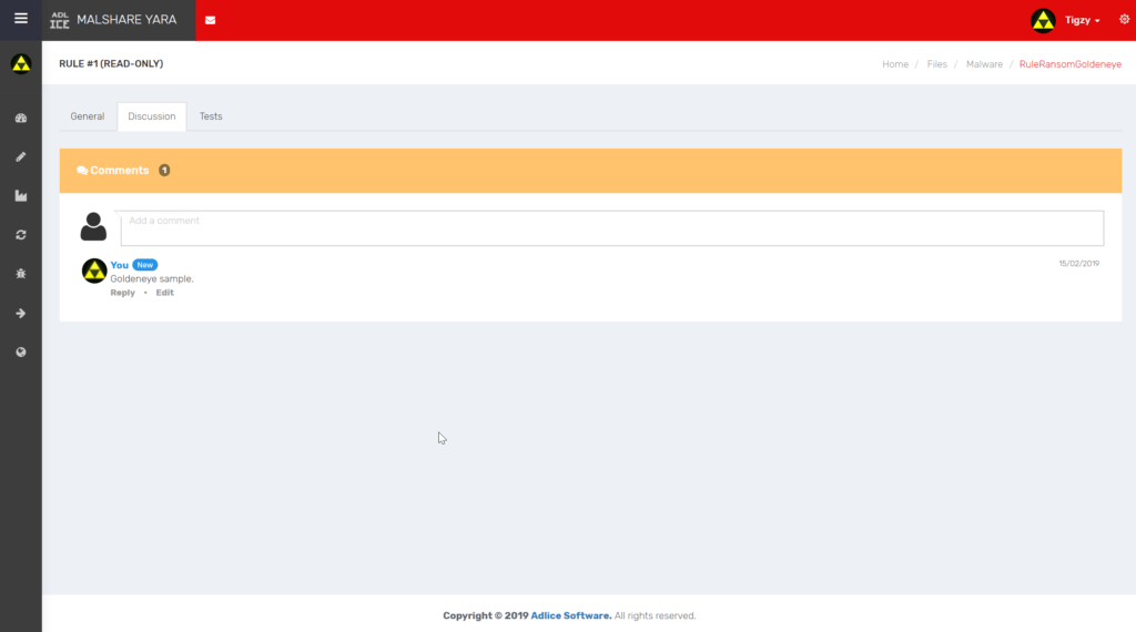 YaraEditor provides a way to add comments to a Rule in a conversational view. If you have something to say, a comment to add to a Rule, start a conversation in the dedicated tab.