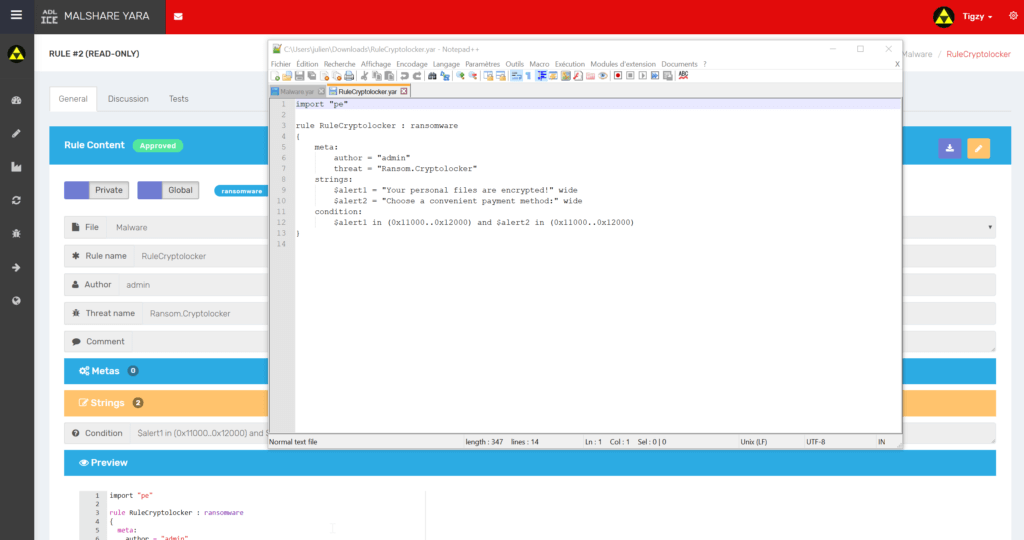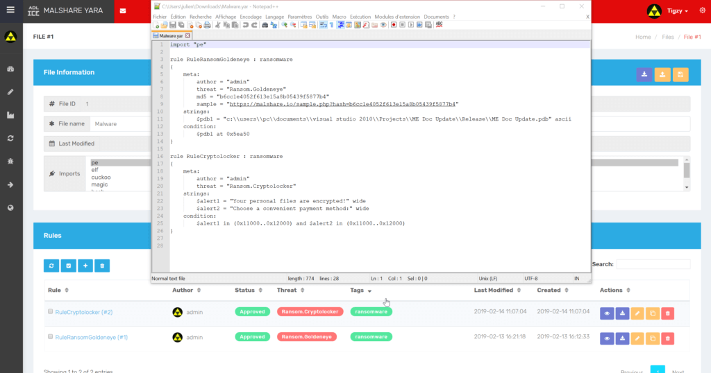 To export rules, open the rule view, and click the “Export” button. A prompt to download the file will be shown, allowing to save the file on disc.