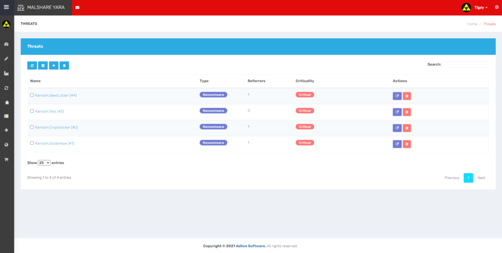 Threats page shows the threat names created in all the rules.