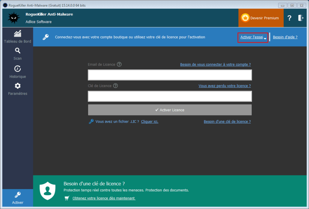 Pour activer votre version d’évaluation, ouvrez le logiciel et accédez à l’onglet “Activer”. Ensuite, cliquez sur “Essai gratuit? Cliquer ici.” puis “Activer l’essai”.