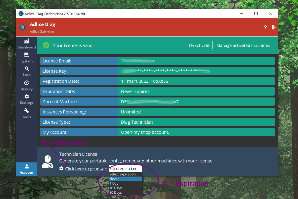 Sur la machine tech, allez dans l’onglet “Compte”, vous devriez voir quelque chose de similaire à l’image ci-dessous. Vous pouvez choisir une date d’expiration (ou jamais) pour ajouter une couche de sécurité au cas où vous oublieriez de supprimer le fichier de la machine cible. Après le nombre de jours choisi (à partir de maintenant), le fichier généré cessera de fonctionner.