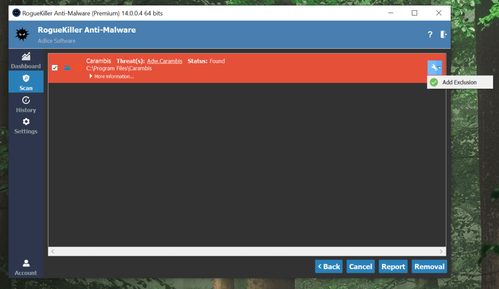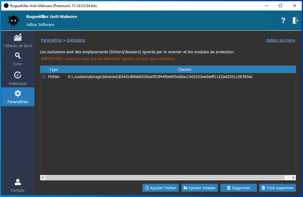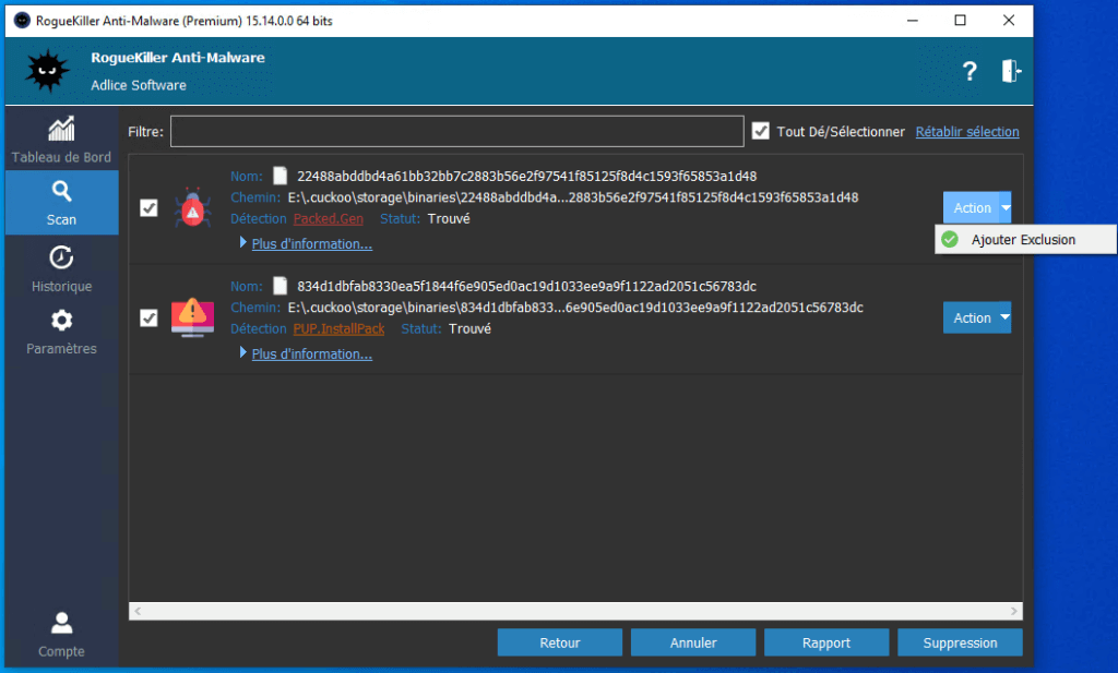 Après exécution d’un scan, vous aurez peut être le besoin d’ignorer certaines détections, pour une raison donnée. Même si nous ne le recommandons pas (en cas de faux positif, c’est toujours mieux de nous le faire savoir), il est toujours possible de rajouter un élément aux exclusions. Pour ce faire, utilisez le menu “Action” et “Ajouter exclusion”.
