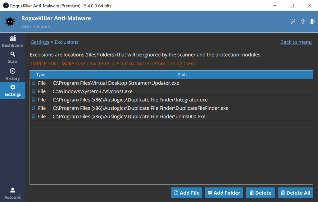 De manière générale, utilisez les exclusions avec précaution. Un logiciel malveillant peut être installé sur la machine, et l’exclure reviendrait à le masquer entièrement du scanner, ce qui peut potentiellement mener à une exécution de code malveillant. Si vous n’êtes pas sûr, n’hésitez pas à nous contacter.