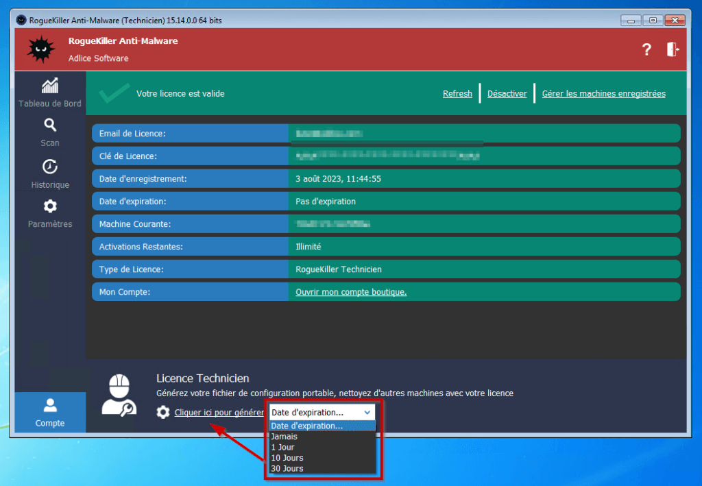 Sur la machine tech, allez dans l’onglet “Compte”, vous devriez voir quelque chose de similaire à l’image ci-dessous. Vous pouvez choisir une date d’expiration (ou jamais) pour ajouter une couche de sécurité au cas où vous oublieriez de supprimer le fichier de la machine cible. Après le nombre de jours choisi (à partir de maintenant), le fichier généré cessera de fonctionner.