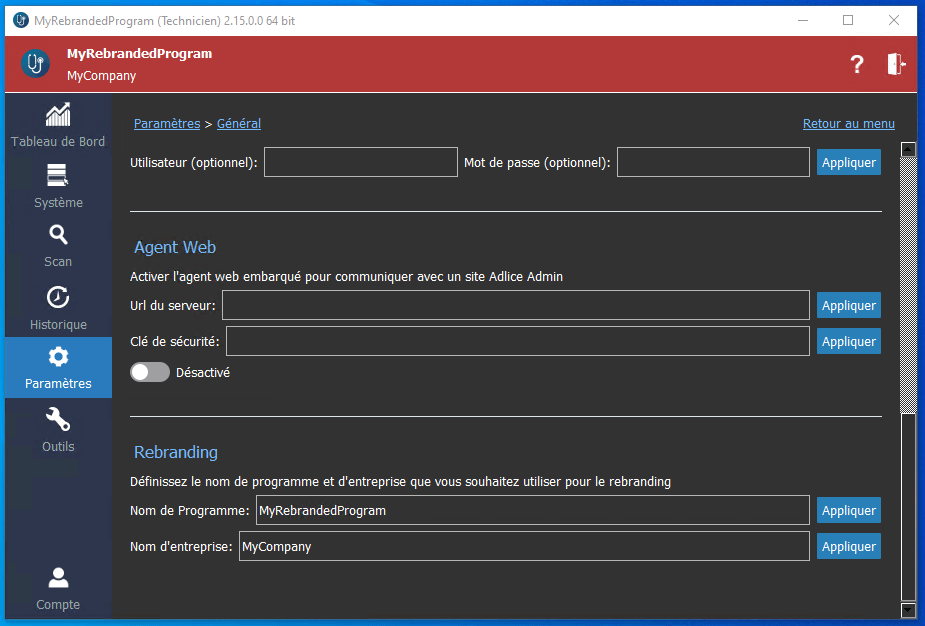 Si vous souhaitez utiliser la fonctionnalité de marque blanche (ou rebranding), you devez la paramétrer sur la machine Tech, au même moment que thème, la langue et les options de scan. Elle sera ensuite ajoutée à votre fichier de configuration quand vous l’exporterez.
