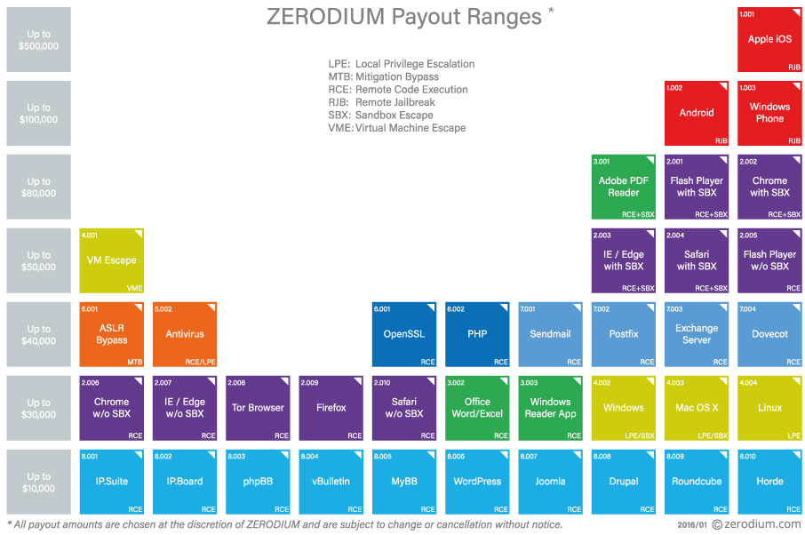 Un autre exemple est le service ZERODIUM, fondés par des experts en cyber-sécurité. La société achète des exploits pour les produits ci-dessous :