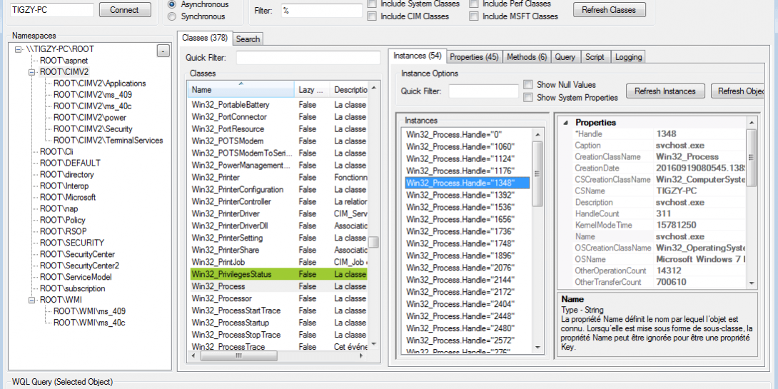 There are a bunch of tools to play with the WMI database, one of the best is called WMI Explorer, that you can download here. For example, this is how we can get the processes list with WMI Explorer:
